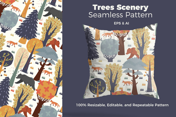 树木森林风景插画无缝图案背景素材