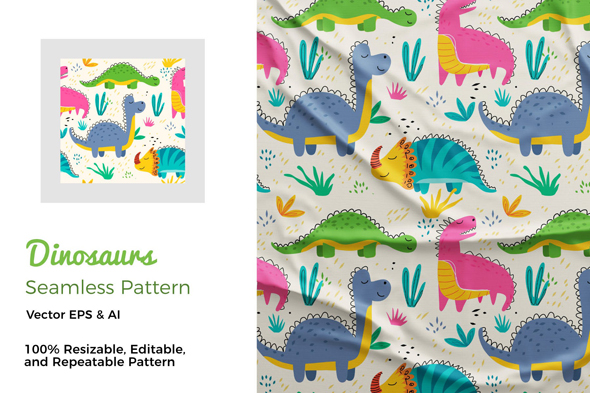 儿童彩色手绘野生动物恐龙插画无缝图案背景素材