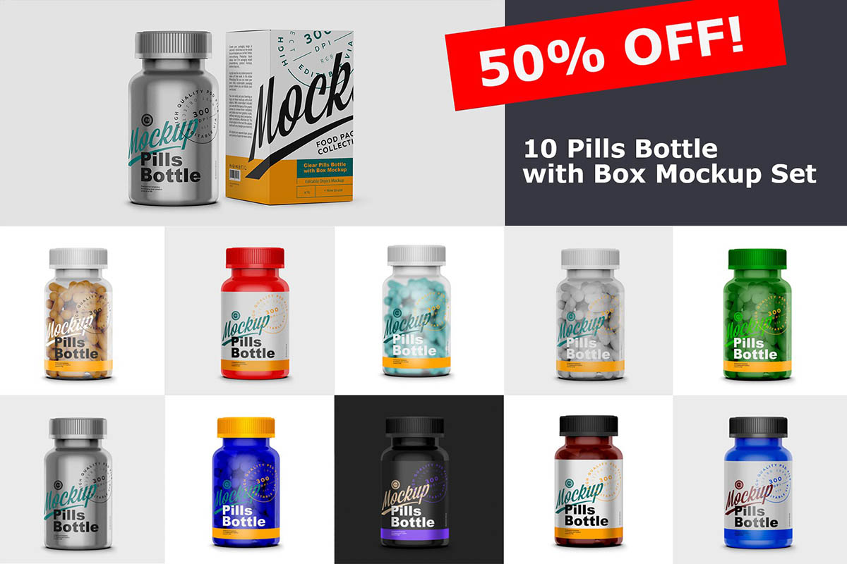 Pills Bottle with Box Mockup Set
