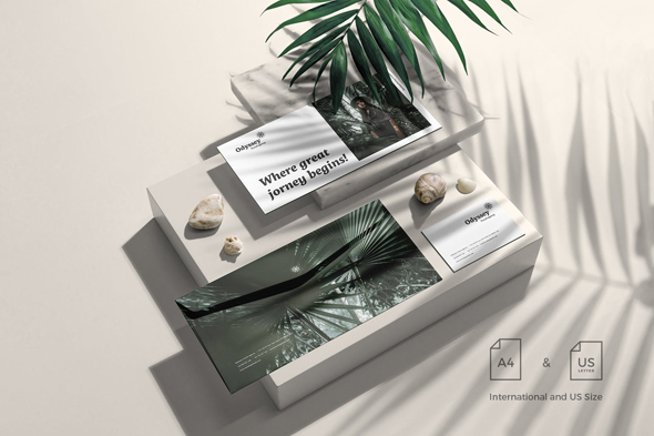 品牌VI设计A4海报明信片组合场景绿棕光影效果展示样机