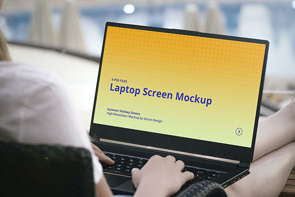 6款Laptop笔记本电脑样机户外场景模拟效果展示智能贴图psd模版
