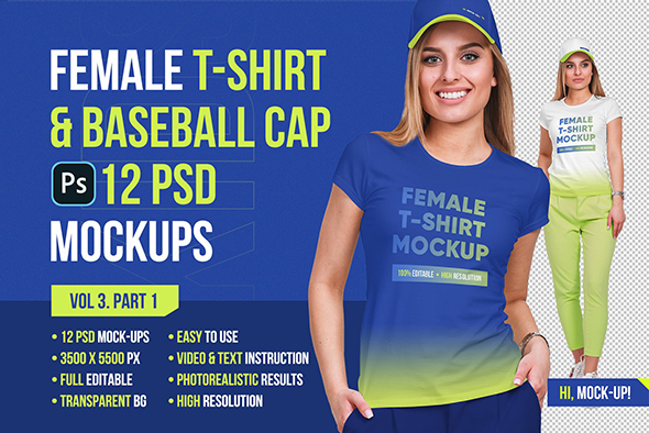 女士鸭舌帽短袖T恤多角度模拟效果展示样机mockup智能贴图psd模版