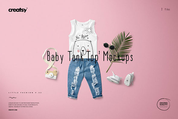 儿童夏季T恤背心服饰搭配样机俯视效果展示样机智能贴图psd模版