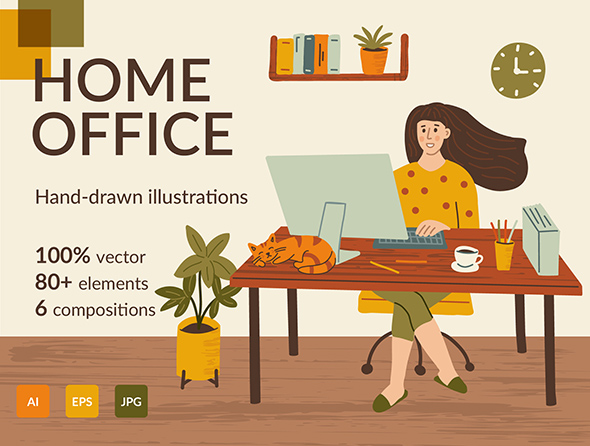 手绘居家办公室人物场景UI界面插图工具包纹理元素