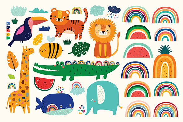 非洲野生动物卡通插画斑马长颈鹿图案设计素材 EPS矢量格式
