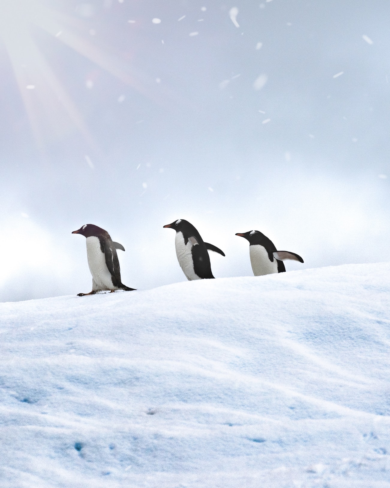南极洲上行走的三只企鹅