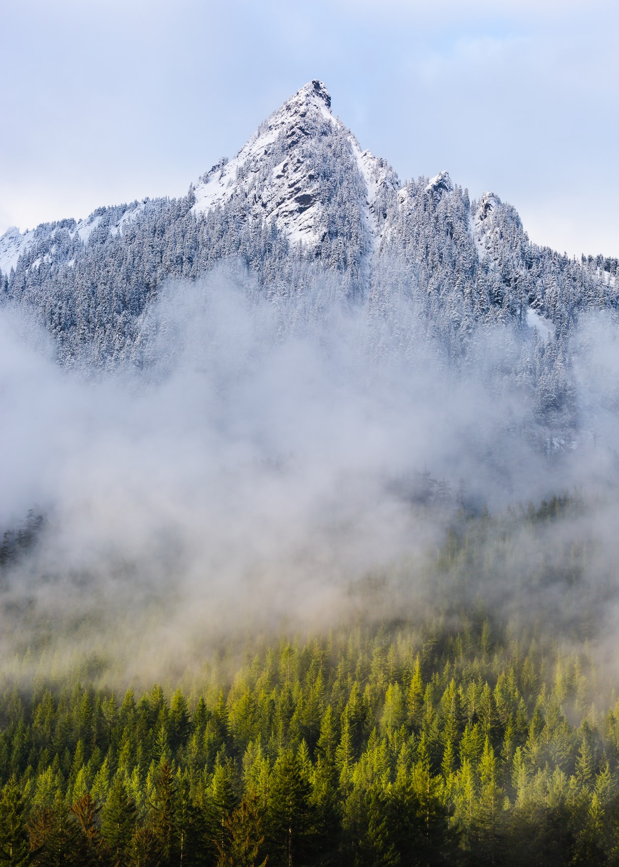 烟雾上的雪白山峰摄影