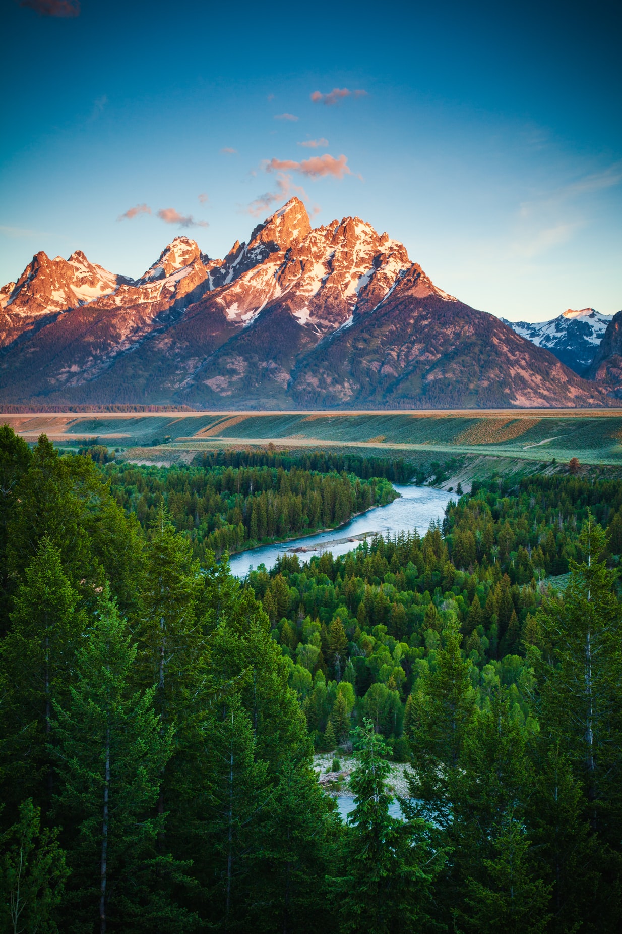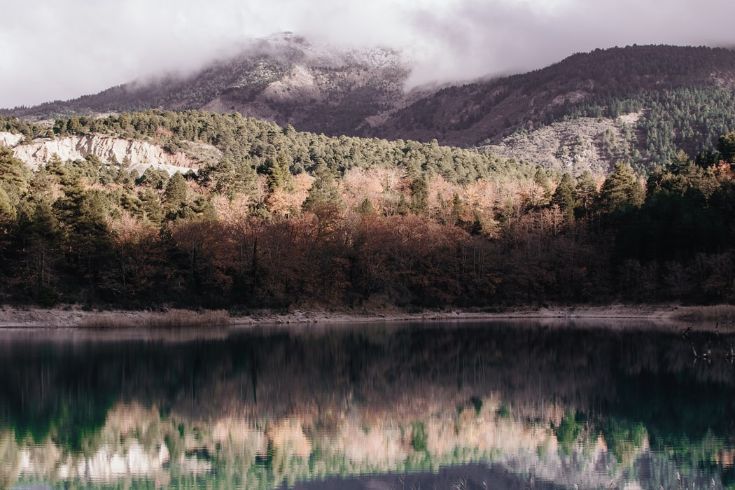 绿色森林远方的红色山脉