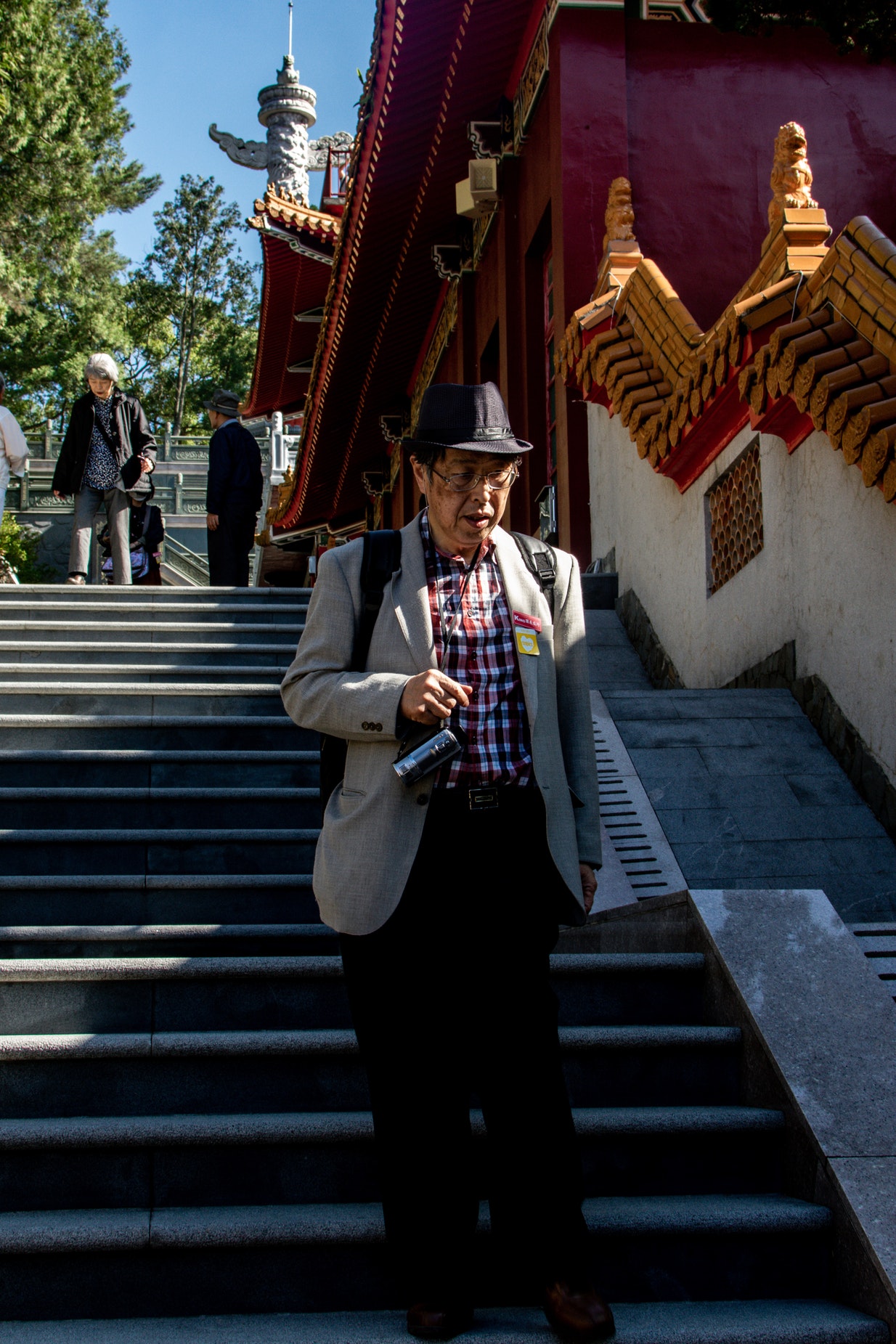 石梯上行走的带帽老翁