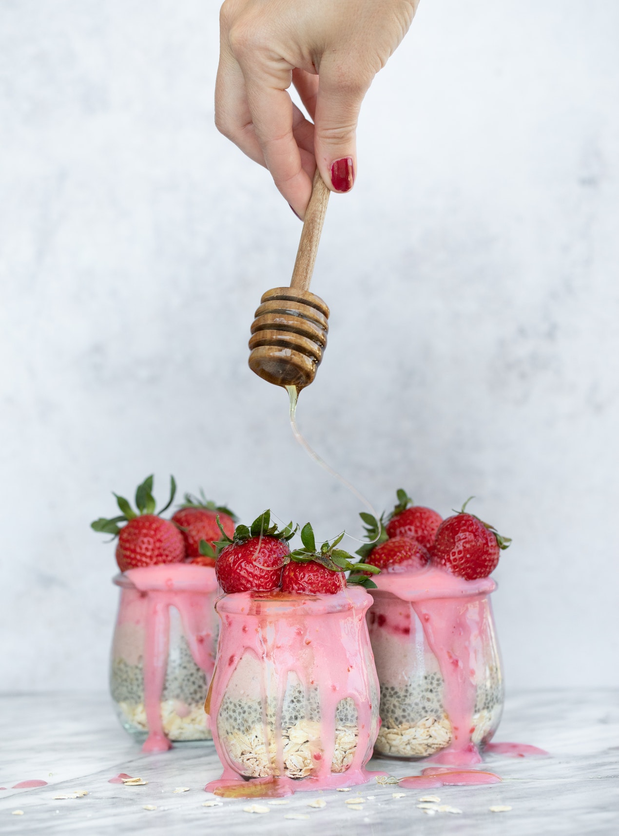 草莓奶油冰淇淋上的拉丝糖浆