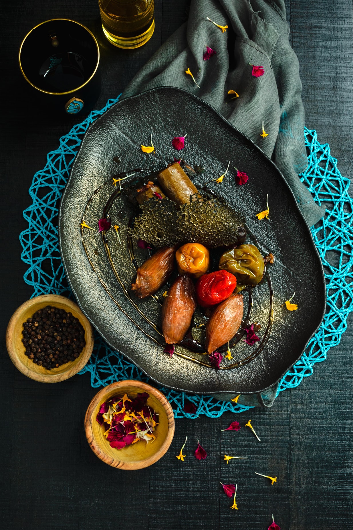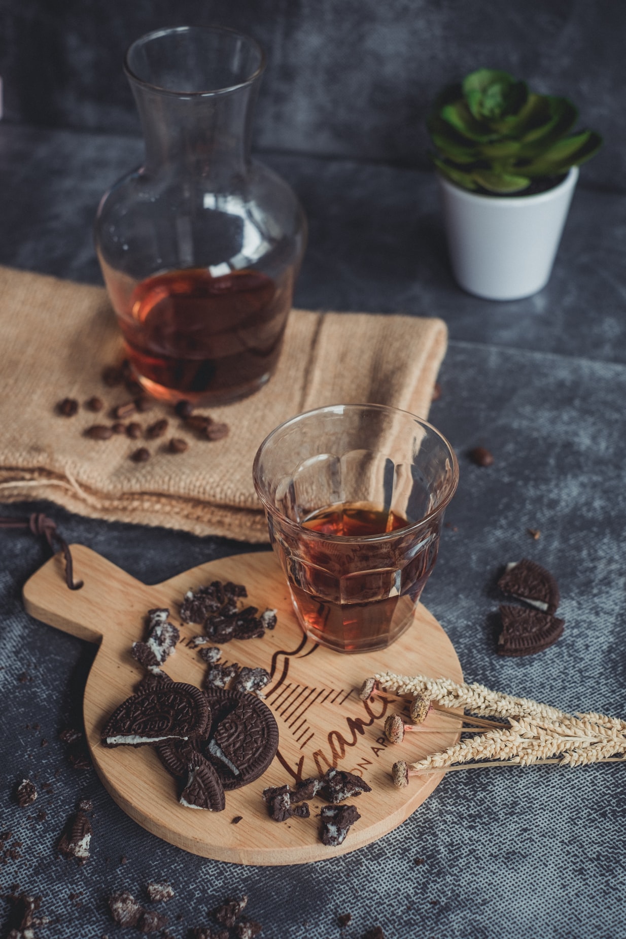 餐具中的食物与桌板上的盆栽