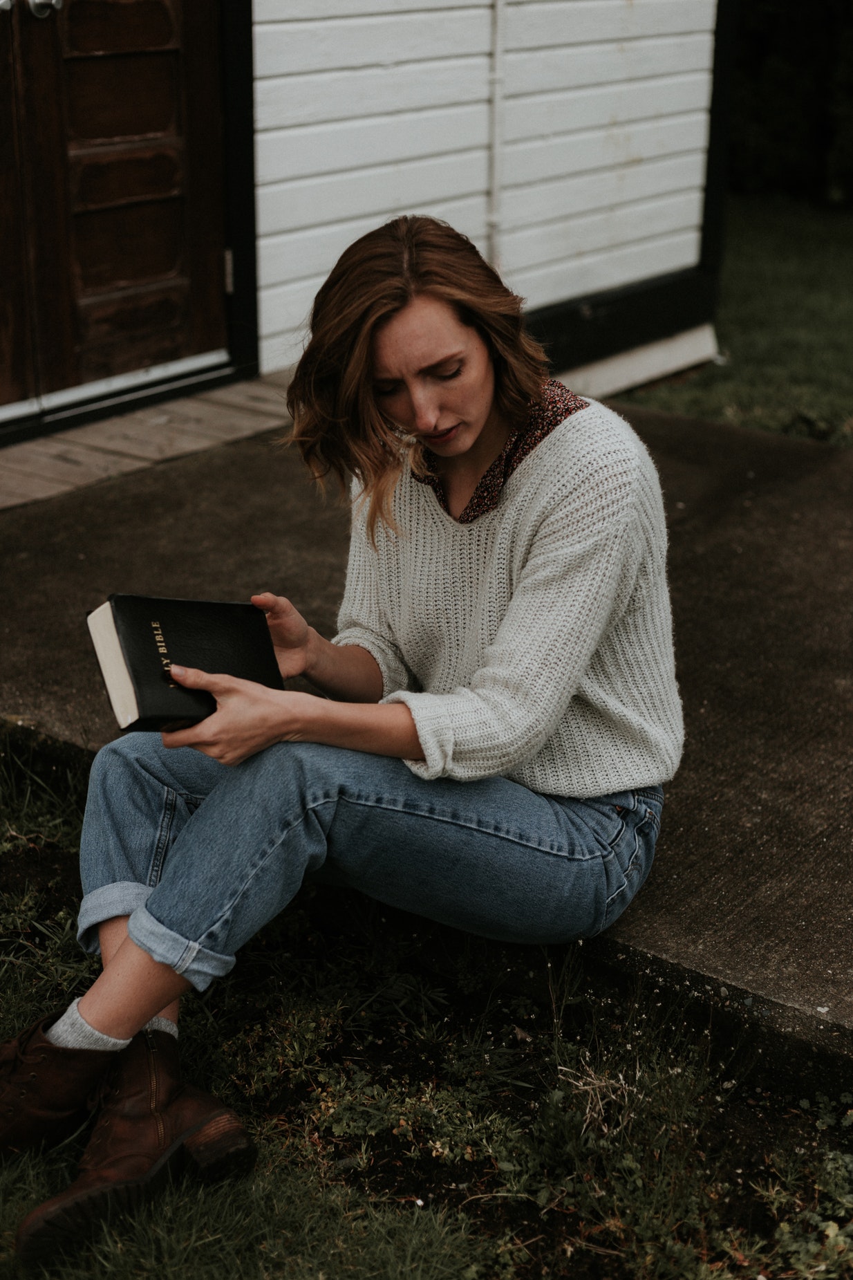 女性人物户外台阶展示圣经