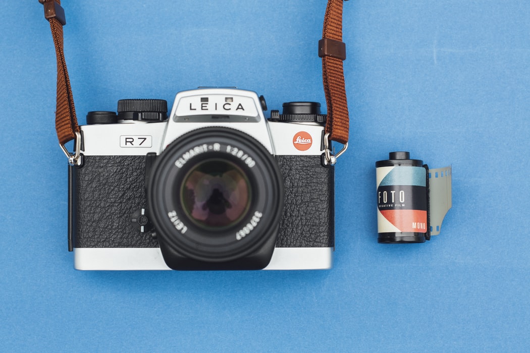 蓝色背景下的黑色相机