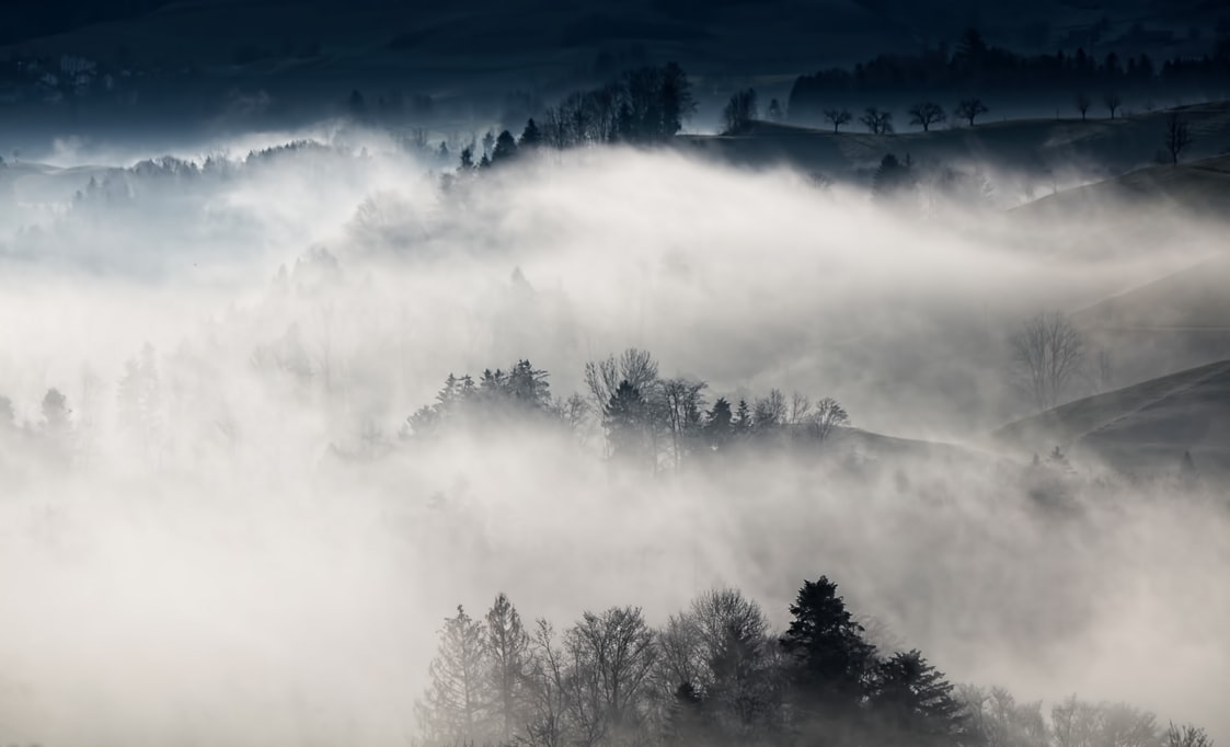 烟雾朦胧中的瑞士森林