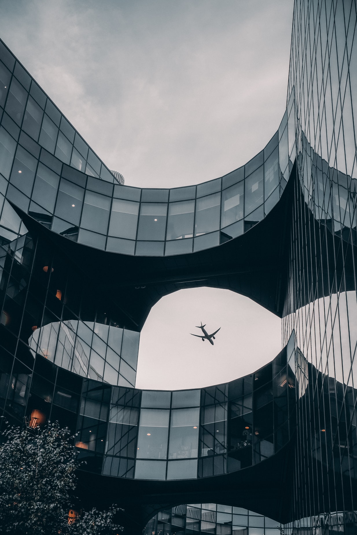 建筑玻璃上的波音飞机